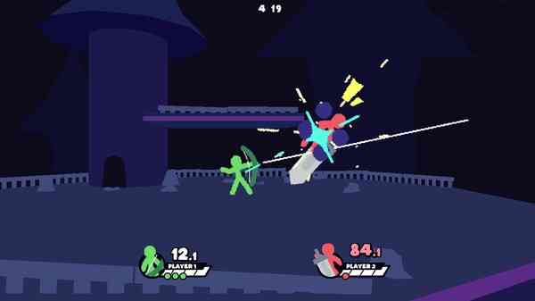 STYLE ON EVERYONE We wanted A FEW QUICK MATCHES to feel like an old-school stick fight, which means flashy animations and impactful moments! To attain this feel, we made it so that most successful hits can be cancelled into air dashes, meaning your follow-up routes are nearly infinite. Deep-diving into this combo system is incredibly rewarding, and landing a well-executed chain of attacks feels uniquely satisfying. While this mechanic is not necessary to enjoy your battles, those who choose to embrace it will push the game to its limits!